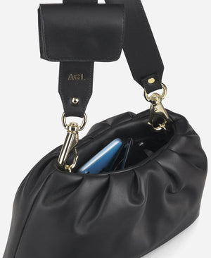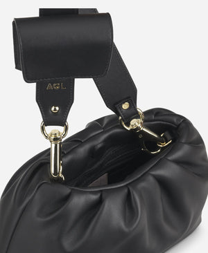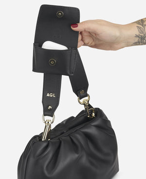 The bAGL CLUTCH MAXI bag is a soft ruched leather pouch closed with a concealed magnetic button. Whether carried with or without its shoulder strap, this versatile bag is ideal for any engagement, from daytime errands to evening drinks. Produced exclusively in AGL's workshops using 100% Italian-made materials, the core DNA of bAGL bags is defined by their functionality, versatility, and design aimed at comfort and organization. Soft, padded, and lightweight, with a clean and minimalistic design, these bags are perfect for pairing with any look, from day to night, offering a casual yet always sophisticated touch. Inside, you'll find a genuine multi-functional organizer with an array of practical pockets, some with zippers and others without, perfectly designed to keep everything you need in order: from your phone to beauty accessories and personal items. The lightweight yet structured shoulder strap is an essential accessory that provides optimal comfort on the shoulder while maintaining an attractive appearance. Thanks to the gold carabiners, the strap can be easily removed, transforming the bag into a soft clutch. Additionally, the shoulder strap is complemented by a removable PERSONAL POCKET, convenient for storing small everyday essentials such as keys or lipstick.