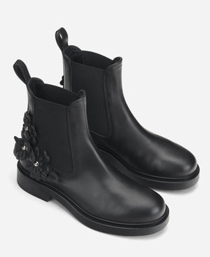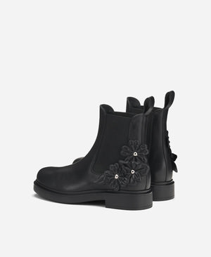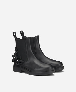 The leather ankle boot with side elastic inserts is finished with the feminine touch of the Giusti sisters: a delicate floral embellishment blooms at the heel, shaped petal by petal using heat in the AGL workshops. Each flower is further enhanced with micro-studs.