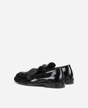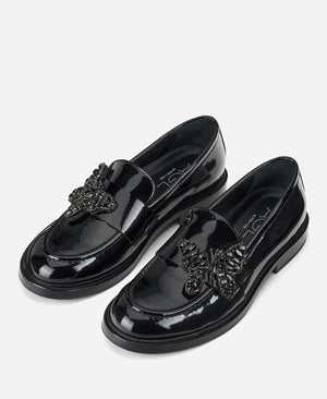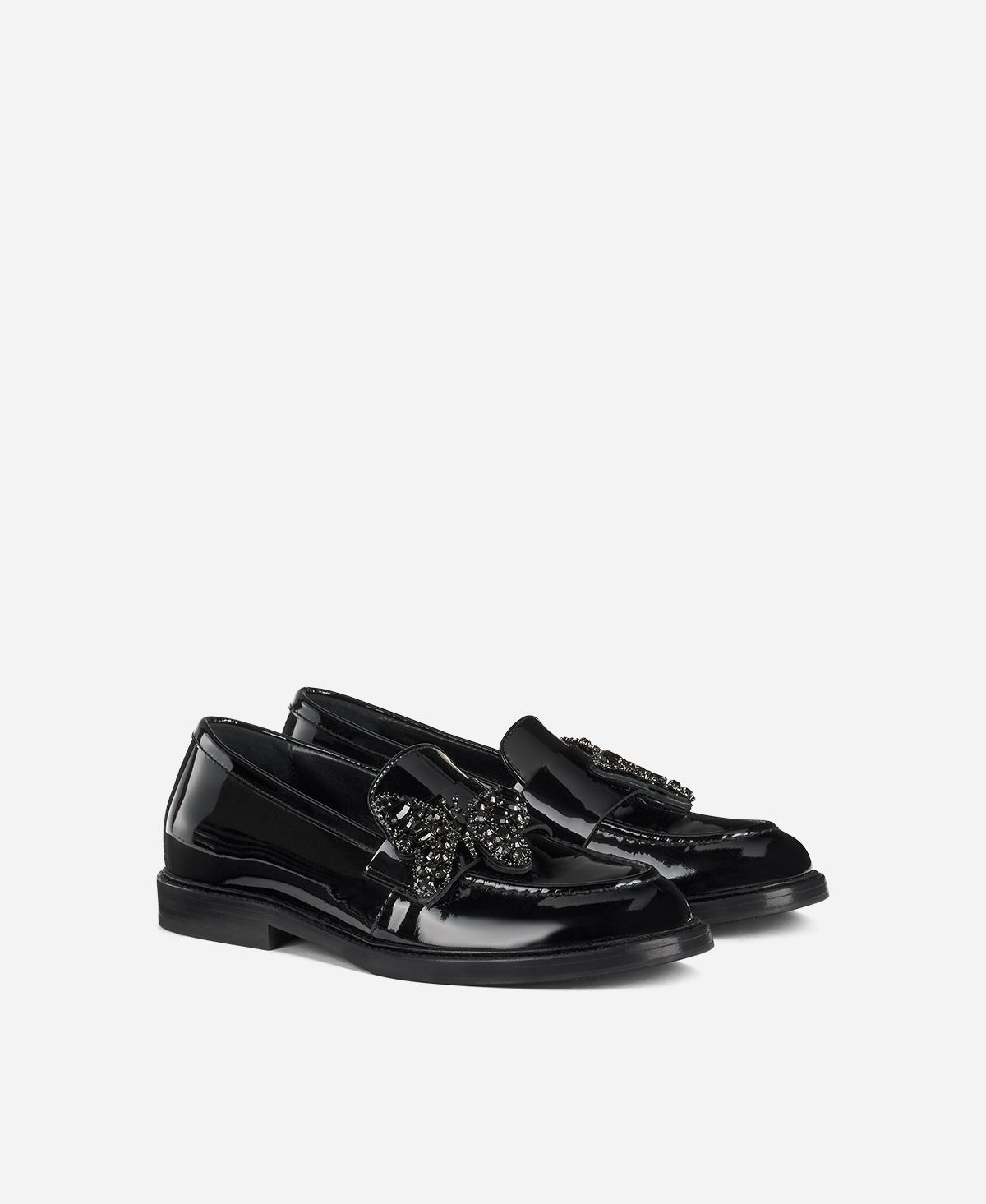 Loafer with a traditionally masculine structure and unmistakable feminine curves. The extra detail: a crystal butterfly appliqué.